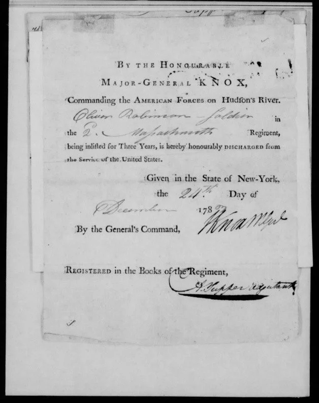 Oliver was under the command of Captain Luther Bailey during his service in Colonel Sprout’s 2nd Massachusetts Regiment, and he makes no mention of any battles fought during that time. His enlistment saw him through the end of the war, where the 2nd Massachusetts was formally disbanded at West Point and Oliver was honorably discharged by Major-General Knox on December 24, 1783.
