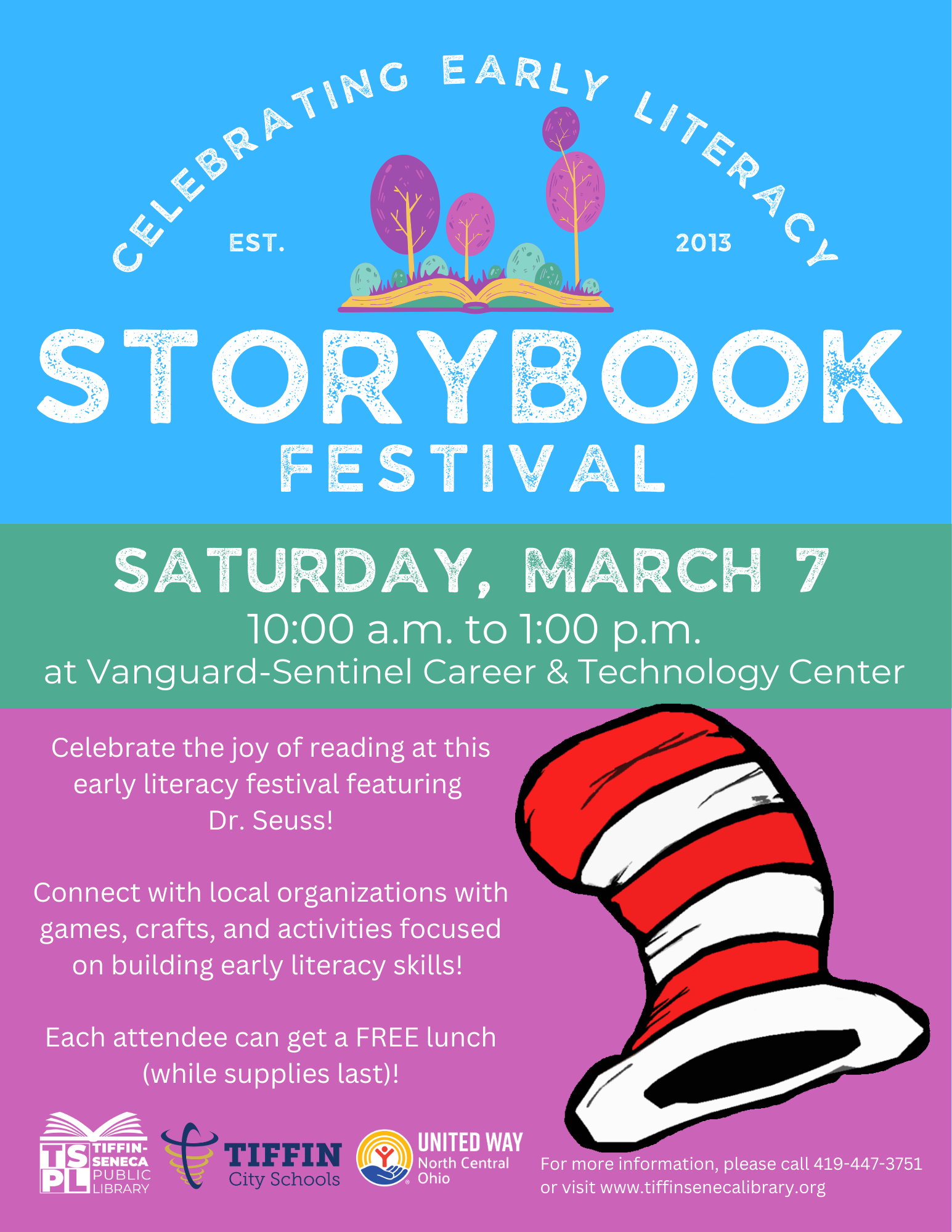 Tiffin-Seneca Public Library, United Way of North Central Ohio, and Tiffin City Schools are partnering again to host the annual early literacy festival on Saturday, March 7 from 10:00 a.m. to 1:00 p.m. at Sentinel Career & Technology Center at 793 East Township Road 201.